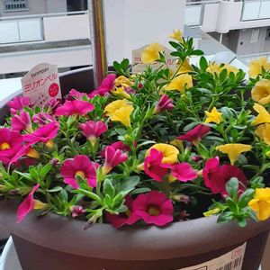 サントリーさんから頂いた ミリオンベル🔔 チェリーピンクとイエロー モリモリ咲くように 寄せて見ました♪♡ 可愛いくって玄関前に置いてます 間違ってました😅 切り戻しは必要で 花柄つみは不要ですね!🙏 私のような初心者にも 可愛く育てる事が出来ます♡ (ㆀ˘・з・˘)*・゜゚・*:.。..。.:*・' .。.:*・゜゚・* サントリーさん ありがとうございます😊