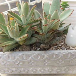 昨夜の多肉事の記録投稿をさせていただきます。 カランコエのうさぎシリーズの中でも 250〜70円の普及種🐰さんたちをまとめ植えにしました。 🐰さんだけでは、くどい感じになるので 真ん中近くに仔猫の爪(コチレドン属)を植えてみました。 これから300円オーバーの🐰さんたちを植え替えします。(リビングで) 我が家では300円を超えると高級多肉なので 大胆にまとめたりはしません。