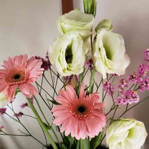 ☀︎Gօօժ ᗰօɾղíղց☀︎ 先日、上の子が学校の図工授業で作った棚を、下の子は学校の室町文化体験で作った生花を私にくれました。記念すべき一枚です💐(ミニバラとジニアは自分ちのお花です)。
