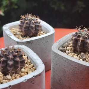 ミニミニサボテン 10×10㌢の四角い鉢に サボテン🌵がいっぱい 1番大きいので 背丈6センチ小ちゃいのが 増えて大家族に✨ 合計3鉢並んで 暑いけど☀️ 頑張ってるよ〜💝 ベランダチーム