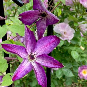 去年見切り品でお迎えしたクレマチス ベノサバイオラシアが一気に開花し始めました🎶✨ タグがなくなっていて名前がわからず、鉢にはジャックマニー系とだけ書いてあったものをGSで尋ねてみたところ、違うビチセラ系だとわかりました。どちらも強剪定のタイプでよかった〜🙂 この鉢はペットの犬が普段は行けないところに置いていますが、念の為柵でブロックしました😁