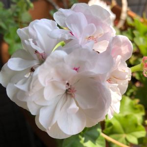 ゼラニウムのホワイトトウローズさん 白かった花びらがほんのりピンク色に染まってきました 一年中咲き続けてくれて 本当に良い子😊 でもこれからの過酷な夏は涼しいところで 休ませてあげないとね