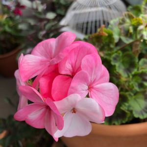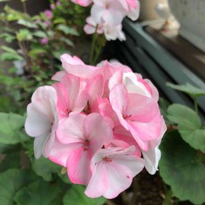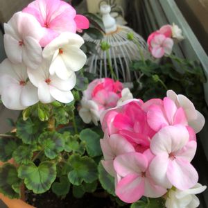 ベランダのゼラニウム ホワイト トゥ ローズさん 冬は濃いピンク色だったけど、今は白っぽい花びらです うちに六鉢あるゼラニウム 植え替えに取り掛かろうかな…と重い腰を上げて