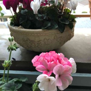 ベランダのお花たち ゼラニウムのホワイト トゥ ローズさんの蕾もまたたくさん上がって来ましたよ🤗 11月の初めに植えたシクラメンもまだまだ元気 絶えずお花を咲かせる良い子たち✨