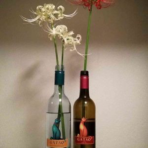 我が家のヒガンバナ ワイン🍷のビンに 紅白で遊んでみました