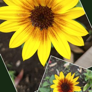 🌻サンビリーバブル・ブラウンアイガール🌻 先週お迎えした♡ʾʾ1,000輪咲きひまわり🌻 蕾が付いていた二輪が咲きました🧡反対を向いているのでコラージュで🌿🤗