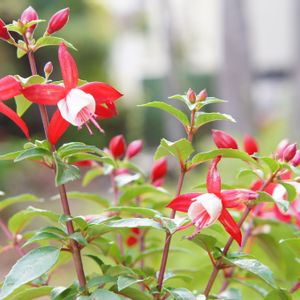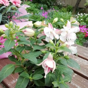 . . 𖤣𖥧𖥣𖡡 フクシア'プーニー' 𖥣𖡡𖥧𖤣 下向きに垂れ下がるように咲く様子が イアリングのように可愛らしいお花𓍯.*° 優しいピンクと白のグラデーションが愛らしい🪴🤍 とてもコンパクトにまとまり、 春から秋にかけて長い期間楽しめます✨ *育て方* 日当たりの良い場所を好みます☀️ただ夏の直射日光には弱いので、風通しの良い半日陰で管理してください🌱 水やりは土の表面が乾いたらあげてください🚰