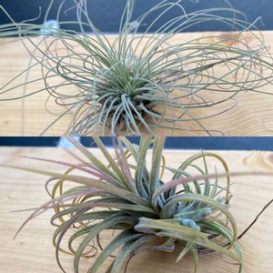 今日のお花チランジア ①昨日も投稿したイオナンタイオナンタ、今朝見たら反対側にも花芽が😆 ②ウスネオイデスが蒸れないようにワサワサだった株をばらしてIKEAのハンガーに取り付けた。面倒くさくて疲れた😖💦 ③板付けにしたチランジア いろいろ。板にちゃんと付いてるのもあればグラグラしてるのも有り(笑) ④チランジア キセログラフィカ 見えにくいけど2株くっついてる。どちらが親かわからなくなった💦 ⑤チランジア いろいろ。水浴び後の乾燥タイム…ととのった😇