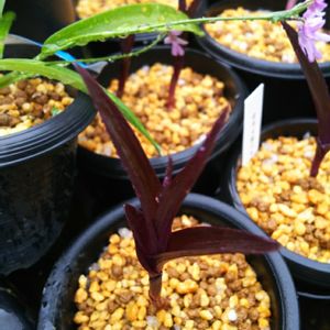 山口産のカラス葉カキランです。産地や個体によってはあっという間に褪色して緑になってしまう(暗む)ものもありますが、本種は黒紫のカラス葉が長く楽しめます。