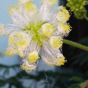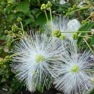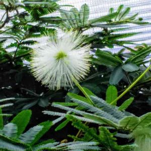 白花の ネムノキは 幻想的です 夜になると 葉は閉じて 眠ります でも 花は 夜開きます ピンクや 緋色の 合歓の木は 扇形半円形の 花ですが 白合歓は 丸くオジギソウより大きいけれど 似た丸い花を 咲かせます オジギソウは 草だけど 白合歓の木は 木で 大きくなります オジギソウの葉は 触れると 閉じますが ネムノキは 触れても 反応しません 光センサーを持っていて 光が当たると 開きます