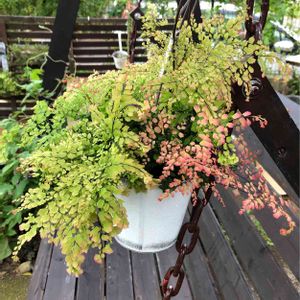 アジアンタムピーコック ☘️ 長雨でぐんぐん大きくなりました💕 この子は新葉は赤く徐々に緑に変化します。 大きな金木犀の木の下、ブランコに吊り下げてます。
