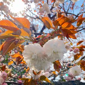4月5日 神奈川県寒川町で撮影。スマホ撮影です。 寒川駅前の八重桜が咲いていました。 うっすらピンクのお花です🌸 葉っぱが綺麗に色づいていました☺️