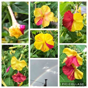昨日の帰り道 オシロイバナが咲いていました。 同じ枝にピンクと黄色の花が✨♫ 1つの花でピンクと黄色もありました😊 つぼみも二色✨ 虹も見えて🌈嬉しい日でした。\(^o^)/ みなさんも良い事ありますように❣️