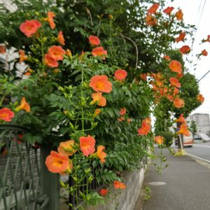 ノウゼンカズラ 咲いてます もう夏ですね 真夏日〜猛暑日になりそうです 汗っかきなので暑いの嫌い‼️ それともまだ更年期が続いてるとか⁉️😂🤣😂