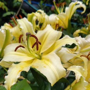 テッポウユリですか❓ たしか去年も咲いてたけど、お店辞めてから手入れがされてないような🥺 でも毎年花は咲く シャッター前は花畑、ミニトマト🍅も色付いてるということは…