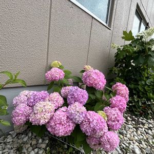 アジサイ霧島の恵 四季咲き紫陽花ということで 他の紫陽花よりいつも開花が早いですね 同じ品種が2ヶ所に植えてあるので 出来れば違う色に咲かせようと思い 土を変えているのですが・・・ ブルーにしたい方がなかなかうまく行きませんね😅今年は赤紫で咲きました💜 ピンクの方はガレージ倉庫の北壁に沿って植えてあるので太陽は朝の数時間しか当たらないにも関わらず 毎年 陽当たりの良いブルーよりも早い目に満開を迎えます 霧島の恵みは茎が柔らかいにも関わらず花房が大きいので 重みでお辞儀しがちですね😂