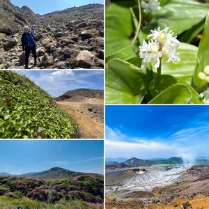 おはようございます 先日の阿蘇山登山です 北外輪山から阿蘇五岳を眺めると、お釈迦様の寝姿に似ていることから「阿蘇の涅槃像」(あその ねはんぞう)と呼ばれています その御釈迦様のお腹を歩く時の何とも言えない幸福感、一番好きな御山です♡ 火山灰に咲く数少ないお花、Google先生はマイズルソウと教えてくれましたが、山頂で岩に張り付き力強く群生で咲いてました そして、下界では、今年少し咲くのが遅いミヤマキリシマ‥‥又来週来ますね 山行も、暑くなってきて修行の様になってきましたが、身体が許す限り登りたいと思う今日この頃です