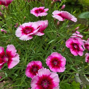 今日のお花 なでしこ💠🌼💠🌼 ①②我が家のなでしこ全盛期…5/29📸 ③⑤切り戻し後、今朝のなでしこ🌼💠 ④小さなバッタさんも暑い中、沢山訪問してくれています🤗
