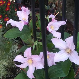 今日は変な天気🌦️ そして蒸し暑い☔🌦️😵 ちょっと動くと汗だくに~💦 GS見ながらひと休み☕😃 クレマチス ミルキーウェイ** 《品種記録》 Clematis 'Milky Way' 開花期:6から9月 花 径:4から6cm 草 丈:0.8から1.2m 剪 定:強剪定 作出国:日本 作出者:杉本恭子 淡紫ピンク色に花芯は黄色。咲き始めはやや下向きから咲きすすむにつれ横向き咲き、やや上向きに咲く。 花つきが良く、すっきりした花形と動きのあるがく片が魅力的。 四季咲き性、耐寒性・耐暑性あり。インテグリフォリアとロココラの交配種。 ムーンー・リバーのピンク版。 ●花後の剪定:地際から1から3節残して剪定 ●冬の剪定:地際で剪定