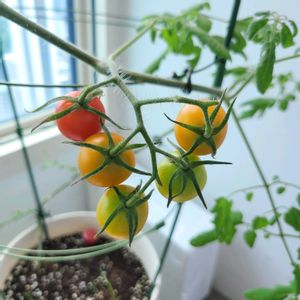 こんにちは🤗 ミニトマトちゃん徐々に色づいてきました❤️ そしてしばらくの間何の変化もなかった唐辛子。 ついに変化が!!! やっと根が張ったのか急に葉の数が増え 成長点には蕾かな? 脇芽なんかも 生えちゃったり🤣 あと、5日前に植え替えたバジルちゃん🌱 週末には摘芯をしてみようかと思います✂️