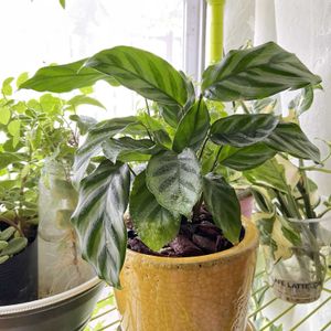 初投稿✨ たしか3coinsで出会ったカラテアさん。 ビタミンカラーの黄色い鉢の中で、私が沈んだ気分の時も元気を分けてくれます♫ 葉水を頑張って3ヶ月、まだサイズは小さいけど新しい葉を伸ばしてくれていまーす! 【追記】 投稿時に「カラテア マコヤナ」のタグをつけていましたが、 違う種類だとわかりタグを変更しました。