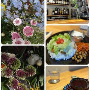 藤を見た後細い道を歩いているとバイト帰りの娘の友達とばったり会いました。 古民家を改装したカフェでランチ、お茶しました。 入り口にはお花も売っていました。 お酒も沢山並んでいました。