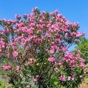 【 キョウチクトウ ( 夾竹桃 ) 】 夏から秋にかけて見かける 桃の花に似た白やピンク 赤などの花を咲かせる 美しくも危険( 有毒 )な植物 今日のお花です
