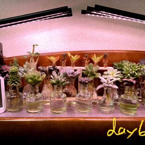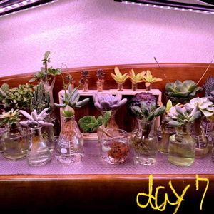 多肉植物の水耕栽培70日目。 どようびなので水換えした(*´ω`*) センペルビウム山彦さんが完全に徒長していたので胴切りしました。 あとエケベリアのグリーンアバロニさんはもうダメかもしれません。葉がどんどん落ちています(´・ω・`) エケベリアとセンペルビウムは日光を好む種みたいなので、LED水耕栽培ではうまく行かないことがこれで分かりました(´・ω・`)