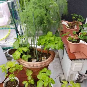 大葉しそ ネットの中でも育ててますが 種から育てたので ありったけの鉢に分けて アスパラの端もお借りして まだ順調に育ってます🎵 虫食いも早期発見で今のところ退治出来てますが、 数日見ないと がっつりやられます その前に 韓国風ニンニク醤油漬け か キムチ漬け にしよう