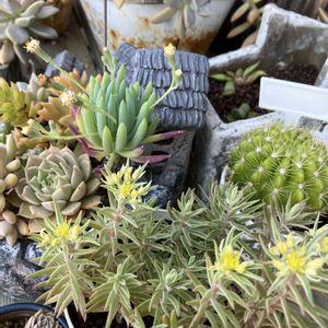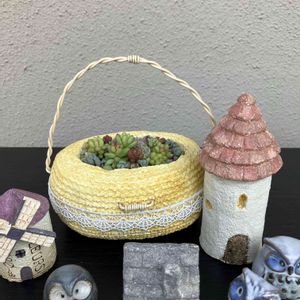 おはようございます。先日作ったカゴに家にあった多肉種を入れました。小さな🏠は色塗りをしました。2 .3は小さいものを選んで植え替えしました。4 孫から貰ったサボテンにお花の蕾かな?出て来ました😃