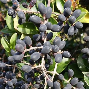 鼠黐(ネズミモチ) モクセイ科イボタノキ属の常緑小高木。暖地の林に自生し、庭や公園にも植えられる。対生する葉は鋸歯がなく、厚く光沢がある。葉を揉むと甘い香りがする。花期は5~6月。枝先に花序を出し、先が4つに開いた白い花を多数咲かせる。果実は核果。長さ8~10㎜の楕円形で、秋~冬に紫黒色に熟す。核は長楕円形。ヒヨドリなどの野鳥が旺盛に果実を食べ種子を散布する。 果実の形状がネズミの糞に似ていて、葉が黐の木(モチノキ)に似ることが名前の由来。女貞(じょてい)ともいうが、中国では女貞は唐鼠黐(トウネズミモチ)にあたる。種子は女貞子(じょていし)という漢方薬で、滋養強壮や老化防止などに効果がある。本来はトウネズミモチの果実を女貞子とするのが正しい生薬名であるが、日本では特別に区別せずネズミモチの種子も女貞子として使用している。成分は同じ。太平洋戦争で物資不足だった時代には、種子を炒ってコーヒーの代用品とした。別名の玉椿(タマツバキ)は、葉が椿(ツバキ)に似ることに由来する。本来はツバキの美称として歌などに詠まれる言葉で、柾(マサキ)の別名として用いられる場合もある。 よく似たトウネズミモチとの違いは次の通り。 ネズミモチ ・花期は5~6月 ・葉を光に透かしても葉脈があまり見えない ・果実は長楕円形で、潰すと指が紫黒色に染まる トウネズミモチ ・花期は6~7月 ・葉や丈が大型 ・葉の先は細くなって尖り、光に透かすと葉脈がはっきり見える ・果実はほぼ球形で大量につき、潰しても指は染まらない ・中国原産で明治時代初期に渡来した。工場や公園の緑化樹だが野生化している 出典『木の実のガイド』『薬草の呟き』『身近な樹木図鑑』『樹木の名前』