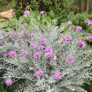 🌿セントレア ギムノカルパ 舌をかみそうな名前ですね シルバーの葉にアザミの様なお花が 可愛いです💕 1年で随分大きくなりました🤗