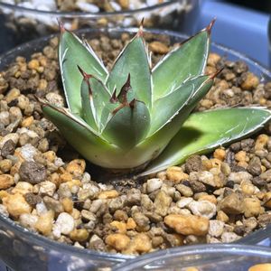 最近、a型にはまってまして(照)。 資料も中々に無いからググって資料(情報)を回収し、備忘録として張り込んどきます。(ググるも死語か?) 余談ですが、Xで知った内容でFC2の無料ホームページサービスも終わったとか、、。 ネット上にプールされていた個人が集めたコアな情報/資料が大規模に消失するんでしょうね〜。 最近は検索ワードを入れて探しても個人さんが上げてるHPなんかは教えてくれません。AI が集めた正解か不正解か判らないワードを表示してくれます。信じて良いのか悪いのか?😅 で、、、。 アガベ 王妃笹の雪A型(備忘録) Agave filifera var. Compactaの矮性種。 ※ 矮性種(わい性 / 小形なまま成熟する性質を指す) 調べると「A型」、「B型」、「C型」、「D型」と 小型→大型 の順に呼ばれています。 その中でも「A型」は最も小型とされる品種です。その中でも変異種の「王妃笹の雪 A型 " 白覆輪斑 " 」は通称「ピンキー」と呼ばれアガベ最高峰と呼ばれてます。白覆輪斑、つまり白い斑が葉の縁に入ると言う事です。別に中斑と呼ばれる白い斑が中央に入る品種(オランダにて)もある様です。総称して斑有りのA型をピンキーと称する様です。 但し、白斑の比率にてピンキーか否かの判断?もある様で、、一部の掲載サイトでは偽物に注意との文言もありました。(深し!) 深淵を覗くとき、深淵もまたこちらを覗いているのだ」との、ドイツの哲学者フリードリヒ・ニーチェの言葉を思い出しました。(笑) まぁ、総称して、王妃笹の雪は、小型で美しいロゼット状の葉姿が特徴でフィリフェラ(filifera)系特有の「白いひげ」フィラメントがあります。又、白い模様(ペンキ)が葉に入ることから笹の雪という名前が付けられてます。 B型は、A型に比べて葉の幅が広く、葉の先端が尖っているのが特徴です。個体としては多少は大きい様ですが、確認したネット上で検索映像の中ではA型とB型の判断は難しいと思えました。 C型に関しては本種とは別の品種で、白糸の王妃、滝の白糸、王妃乱れ雪 と言われる品種を指す様です。(深いの〜!) D型は、学名Agave victoriae-reginae(アガベ・ビクトリアエ・レジーナ)の品種の一つで、と有りました。葉の形状や模様の特徴から区別される通称で笹の雪の中でも特に葉の白い模様が美しいものを指すことが多い様です。又、調べると桃太郎が引っかかって来ます。スーパーワイドもしくはアビーブルックとも呼ばれるみたいです。 情報が少ないのでググって今の内に情報を回収し、まとめてみました。不都合がある場合は御一報ください、記事を削除します。 また、間違いが有った場合はご指摘をいただきたいです。 m(_ _)m