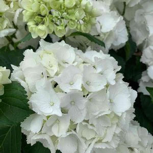 紫陽花、シュガーホワイトが咲いてきました。可愛い💕 でも他のは剪定間違えのか、花芽がなーい😫