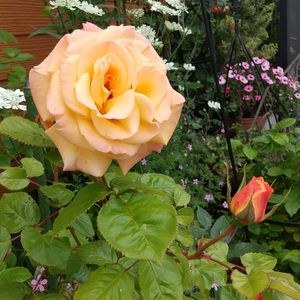 ❝ 薔薇 モナ リザ(Mona Lisa) in my garden ⑤ ❞ ❛ 高さ2m弱のところで咲く、若い一輪 あちらこちらを虫食いされながらも、健気に咲き始めています ❜ こんばんは! コロナウィルス感染、気を緩めずに! ですね! 高い位置なので、カメラのファインダーは使えなくて、両手を持ち上げてモニターを見上げながら被写体の位置を把握して、指でシャッターを押しました。 4月末~現在までも、代わる代わる永く咲いてくれます。 フロリバンダの位置づけですが、FLにしては大きな花で、HTのブルームーンと同じくらいまたはそれ以上の大輪のFLです。 何時ものように、JPEG出しの撮影後の無加工・無修正の撮りおろしです。シャッター押してお仕舞い。 1分間も掛けていませんが、もちろん、カメラで様々な撮影設定はしています。 撮影日:2021年6月13日 午後 焦点距離100mm(=実効)