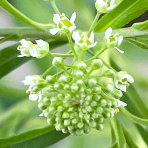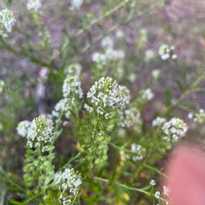 マメグンバイナズナ (豆軍配薺) アブラナ科マメグンバイナズナ属 5~6月 20~50cm 北米原産の帰化種 茎は直立して上部で多数分岐 茎葉は無柄で互生、長楕円形で不規則な粗い鋸歯があり、茎を抱かない 根生葉は羽状深裂してロゼットを形成しますが、花期には普通見られません 花は白色の4弁花で直径約3mm 雄しべは2~4個 ♡(ӦvӦ。) 果実は扁平な円形(長さ約3mm)✨ (ナズナの果実はハート形のような逆三角形) 花言葉 「頑張って」 上手に息抜き、手抜きもしながらですね🥰