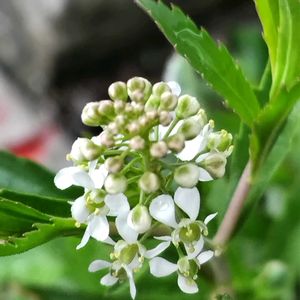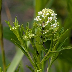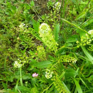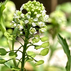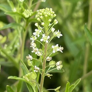 道路脇に1本だけ生えていた白い花。 AIがマメグンバイナズナと教えてくれました。 ② 果実の形が丸いマメグンバイナズナです。 ③ 果実の形がハート形のナズナです。