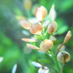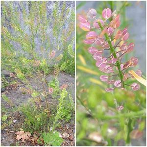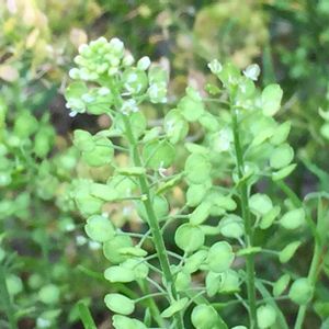 道端のいかした草花シリーズ🎵 マルバグンバイナズナ🎵 ではなく… マメグンバイナズナと思われます。 間違い訂正します。 そもそもマルバグンバイナズナという種類は無いように思われます。 丸いのは実ですし…… 丸いというか、軍配型。 グンバイナズナの方がより軍配型で、マメグンバイナズナはより丸い。 国道1号線、音羽蒲郡インターに入る直前の中央分離帯で風雨に耐えておりました💨💨 車の窓開けて、土砂降りの雨にやられながら撮ったのですが、対向車が通るたびに揺られてしまって、ピントは甘いです💦 丸っこい実と全体像をご覧下さい🎵 次は空き地のマメグンバイナズナを撮ろう………