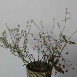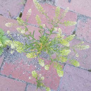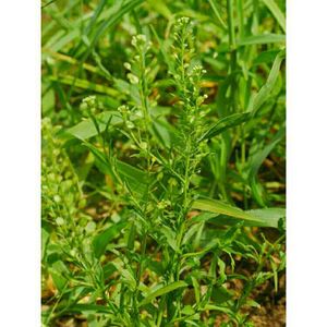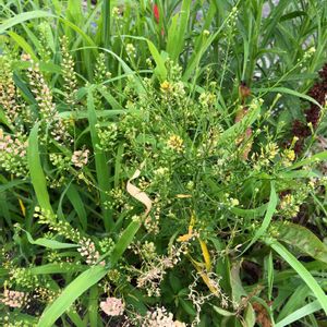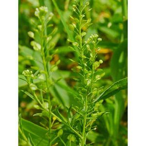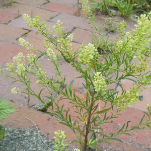 🌿 マメグンバイナズナ 科名:アブラナ科/属名:マメグンバイナズナ属 和名:豆軍配薺/学名:Lepidium virginicum 北アメリカ原産の帰化植物 、明治43年(1910)頃、神戸で採取されたという記録がある 日本全国の荒地、空き地、路傍などに自生 見分け方・特徴 秋に発芽して根生葉をロゼット状に広げて越年~春に発芽する1~越年草で高さ30~60センチ 茎は上部で多数枝わかれして繁茂する 葉は互生、長楕円形で粗い鋸歯があり短柄がある 花は、5~7月頃に、茎の上部に多数の花柄を出して、緑白色小花を総状花序に多数つける 花は、花弁4枚、がく4枚、雄しべ2本 果実は、直径2~3ミリ、扁平な短角果で、ぐんばい状の形をしている 果実は、2室あり中に扁平で楕円形の赤褐色の種子が1個ある グンバイナズナとの違いは、全体がやや小型で、葉がグンバイナズナは楕円形、葉柄が無く、種子が1室に2~5個あるが、マメグンバイナズナは、葉が長楕円形で葉柄があり、種子が1室に1個、で区別するという (e-yakusou.comより引用) 📷 2019年8月7日 OLYMPUS TG-6