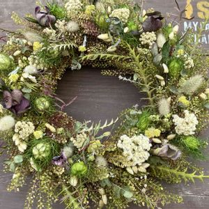 お庭の植物で作ったリース マメグンバイナズナ、クリスマスローズ、ニゲラ、ラグラス、ライスフラワー、ユーカリ、コバンソウ、グレビレアアイバンホー、アンモビューム、モロッコナズナ、シルバーレース、カスミソウ、ハハコグサ、シモツケソウなど マメグンバイナズナは1つの畑にあって、可愛いから草刈り禁止にしてもらっています😅