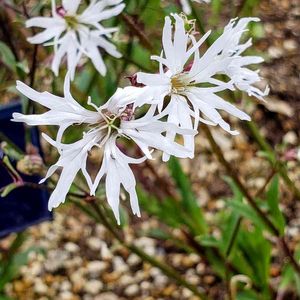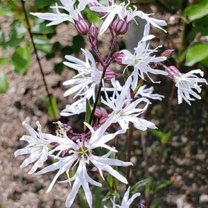 リクニス•フロスククリ ‘ホワイトロビン ’ 長い…💦 別名 カッコウセンノウ 花茎が外側へ外側へと伸びて まとまらないので、何年も前に100yenショップで買った柵で寄せたけど… やっぱりまとまりがない😅 でも、可愛い花( ⸝⸝⸝•_•⸝⸝⸝ )♡︎♡︎