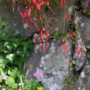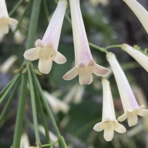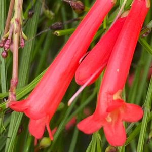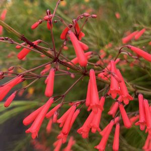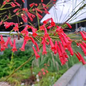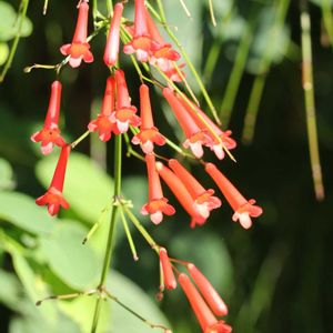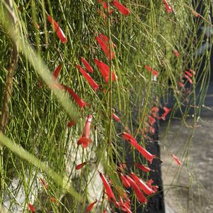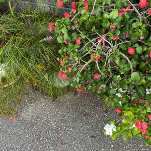 関東で見る花丁子とボリュームが全然ちがう👀 常緑小低木 草丈が50~100㎝ 茎が株元から上に向かって立ち上がり 1m程度の高さから自然に地面に向かって垂れ下がる 葉は茎の各節にあるが気づかないほど小さく見た目は茎と花だけの植物に見える 茎は先端に向かって細かく分枝 花は先端に2~3㎝ 朱赤筒状 他に白や桃 10℃以上あれば1年中開花 4月〜11月頃まで断続的に開花 冬期は生長せず花も咲きにくい 塩害にも強く台風後2週間で再び開花する