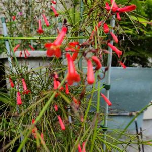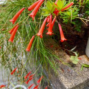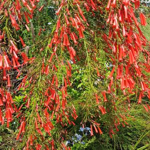 赤い筒状の『ラッセリア』の花が 公園に降り注ぐ様咲いています❤️🌺🌿 和名:ハナチョウジ(花丁字) 科名:オオバコ科 属名:ハナチョウジ属(ラッセリア属)