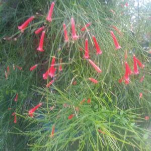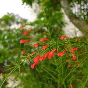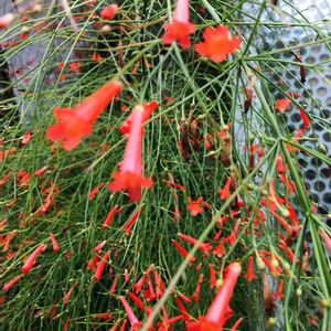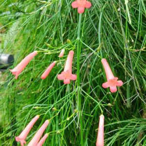 ラッセリア 別名 ルッセリア、ハナチョウジ ゴマノハグサ科(オオバコ科) ラッセリア属(ハナチョウジ属) 細く枝垂れた枝の先に咲く 朱色の花がユラユラ〜可愛らしいです♪