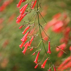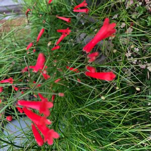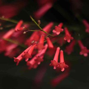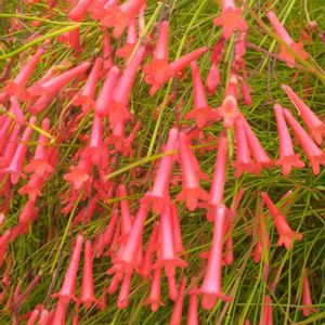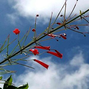 メキシコ原産のゴマノハクサ科ラッセリア属の植物です。高さ50~100㎝の常緑小低木で、名前の由来はこの花の形が漢字の「丁」の字に似ていることから付けられたようです。 草姿の特徴は、茎が株元から上に向かって立ち上がり、1m程度の高さから自然に地面に向かって垂れ下がることです。葉は茎の各節にありますが気づかないほど小さく、見た目は茎と花だけの植物に見えます。茎は先端に向かって細かく分枝し、花はその先端に長さ2~3㎝の朱赤の筒状の花を付けます。1本の主枝に100個を超える花が付き、株一面に花を咲かせます。満開時は赤い水滴が滝のように次々に降り注いでいるような風景になり、非常に人目を惹きます。花色は白やピンクもあります。また、花の付け根をなめると蜜の味がします。10℃以上あれば1年中開花しますが、鹿児島では4月から11月頃まで断続的に開花し、冬期は生長せず花も咲きにくくなります。塩害にも強く台風後2週間で再び開花し始めます。