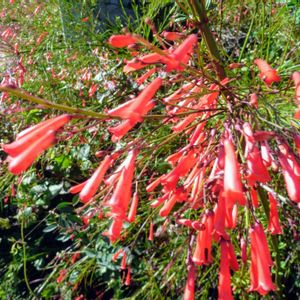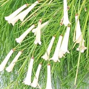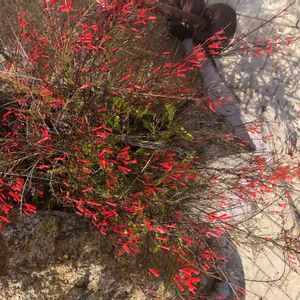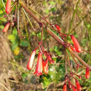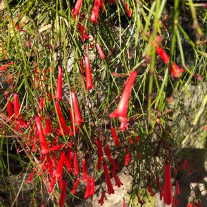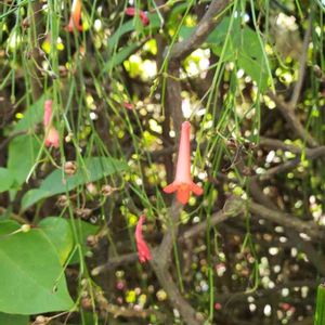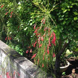 ハナチョウジ;花丁字 [別名] バクチソウ、枝垂れ花火 [中国名] 炮竹紅 pao zho hong [英名] fountainbush , firecracker plant , coral plant , coral fountain , coralblow , fountain plant [学名] Russelia equisetiformis Schldtl. et Cham. オオバコ科 Plantaginaceae ❣️指名手配解除❣️ ♡「まるちゃんさん」のご教示にて判明いたしました。 まるちゃんさんには、この場をお借りして、御礼申し上げます🙏 ありがとうございました🙇♂️ netsurfing🏄♂️informations: ♡ハナチョウジはメキシコ原産のゴマノハクサ科ラッセリア属の植物です。 高さ50~100㎝の常緑小低木で、名前の由来はこの花の形が漢字の「丁」の字に似ていることから付けられたようです。 草姿の特徴は、茎が株元から上に向かって立ち上がり、1m程度の高さから自然に地面に向かって垂れ下がることです。 葉は茎の各節にありますが気づかないほど小さく、見た目は茎と花だけの植物に見えます。 茎は先端に向かって細かく分枝し、花はその先端に長さ2~3㎝の朱赤の筒状の花を付けます。 1本の主枝に100個を超える花が付き、株一面に花を咲かせます。 満開時は赤い水滴が滝のように次々に降り注いでいるような風景になり、非常に人目を惹きます。 花色は白やピンクもあります。 また、花の付け根をなめると蜜の味がします。 10℃以上あれば1年中開花しますが、鹿児島では4月から11月頃まで断続的に開花し、冬期は生長せず花も咲きにくくなります。 塩害にも強く台風後2週間で再び開花し始めます 名前が判りましたので、下記の件は解除致します‼︎ Wanted‼️ 指名手配中‼️ Who am I, John Doe❓ 私は誰でしょう、名無しの権兵衛❓ Tell me my name❣️ 名前を教えて! ♡万葉の藪庭の入り口で、小さな梅の木に寄り添って咲いています。 枝ぶりは細身ですうっと伸びて、*葉っぱは見当たりませんけど⁈ 花は沢山ついてホーキの先のように密集して咲いています。 ちょうど今が満開デス)^o^( *葉っぱが沢山見えていますけど、これは梅の木の葉っぱデス(^。^) GSの皆さん‼︎ 私の名前を教えてくださいマシ🙏 どうぞよろしくお願い致します🙇♂️ by Kazyan's Green Box A rtistic flowers:John Doe;名無しの権兵衛 2020/5/15//past pm 01:30' shooting 2020/5/18//past am 05:50' upload