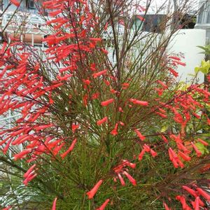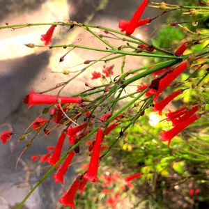 ハナチョウジ(花丁子)(ラッセリア)(Coral plant)(Fire cracker plant)(Okalia ハワイ語) ゴマノハグ(ク)サ科(オオバコ科)チョウジ属(フッセリア属) 原産地: メキシコ🇲🇽 ⏺️赤いラッパ状の丁子(香辛料のグローブ)に似ていることからこの名がついた。 ⏺️10℃以上であれば年中開花する。 ⏺️花の付け根をなめると蜜の味がする。✴️確かに学校の帰りに、なめながら歩いていた記憶があります。😃 ⏺️草丈は50㎝~100㎝。 🌕花言葉は「旅立つのは今」「旅立ち」 ⏺️=fromNet🔍👓 ✴️=私見、私の気持ち。