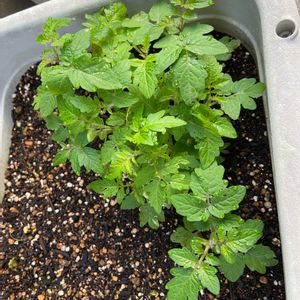 ミニトマト🍅 実が落ちて、勝手に生えてきた苗。 こんな時期から育たないとは思うけれど、あまりに生き生き、青々しているので、植え替えてみるかな💦