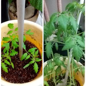 去年、育ててたミニトマトの実で地面に落ちた実を放置してたら、今年、芽が出て苗になって花が1つ咲きました😊 実になるかどうにかはさておき、空に向かって「ここにいますよ~」と超アピールしてるかのように全開で星形の花を広げてます😊 子どもが大喜びしてました😊