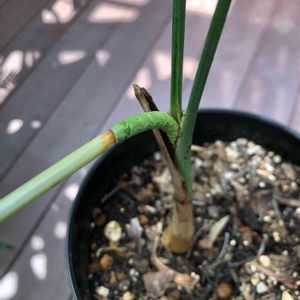奇形したラディカリスの葉を割いて開いてみたら、中から新しい槍が!? 写真では分かりにくいですが、下に置いている葉が新しい槍を着ぐるみのように被っていました。 とりあえず救出できたかな?